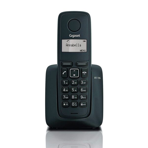 Ασύρματο Ψηφιακό Τηλέφωνο Gigaset A116 Μαύρο. Απλοποιήστε την επαγγελματική ή οικιακή επικοινωνία σας με την πιο λειτουργική ασύρματη συσκευή. Απλό και εκλεπτυσμένο, εφαρμοσμένο με προηγμένες λειτουργίες που ταιριάζει απόλυτα με τις ανάγκες της σύγχρονης ζωής. Ένα ψηφιακό ασύρματο τηλέφωνο με λειτουργία αναγνώριση εισερχομένων κλήσεων και στην αναμονή, ενώ το τηλέφωνο χτυπάει ή κατά τη διάρκεια της κλήσης κλήσεων εισερχόμενων. Με μεγάλη ευανάγνωστη οθόνη και ένδειξη διάρκειας χρόνου ομιλίας. Επιπλέον, διαθέτει λίστα επανάκλησης 10 τελευταίων κλήσεων, ξυπνητήρι και κλείδωμα πληκτρολογίου. Το ασύρματο τηλέφωνο A116 της Gigaset σας δίνει την δυνατότητα να ενεργοποιήσετε την λειτουργιά eco εξασφαλίζοντας εξοικονόμηση ενέργειας και μείωση της εκπεμπόμενης ακτινοβολίας. Αυτή η συσκευή θα σας κερδίσει από την πρώτη χρήση της και θα αποτελέσει αναπόσπαστο κομμάτι της καθημερινής σας επικοινωνίας