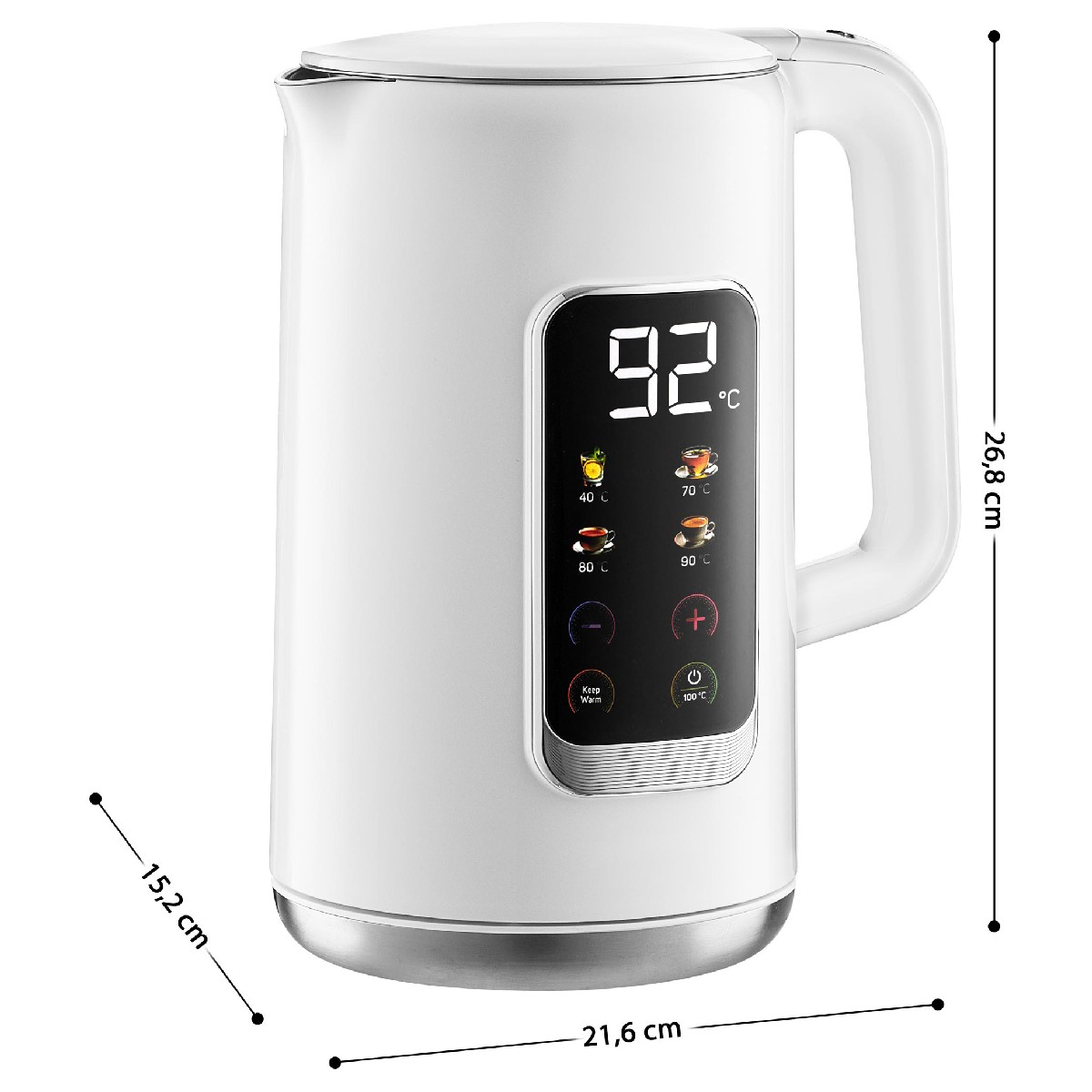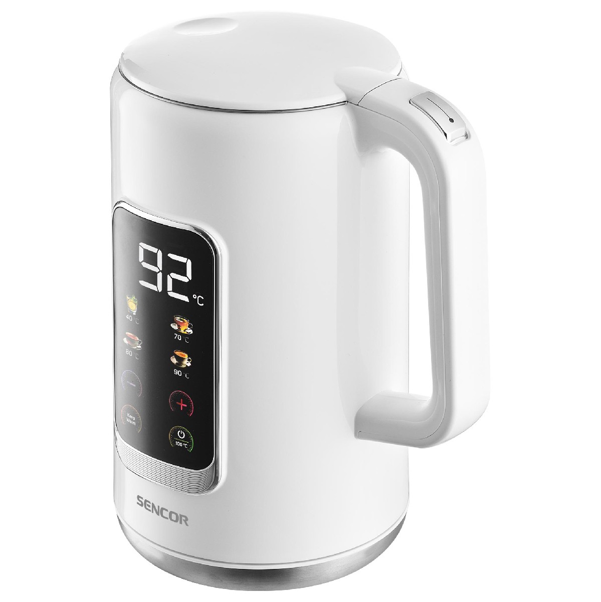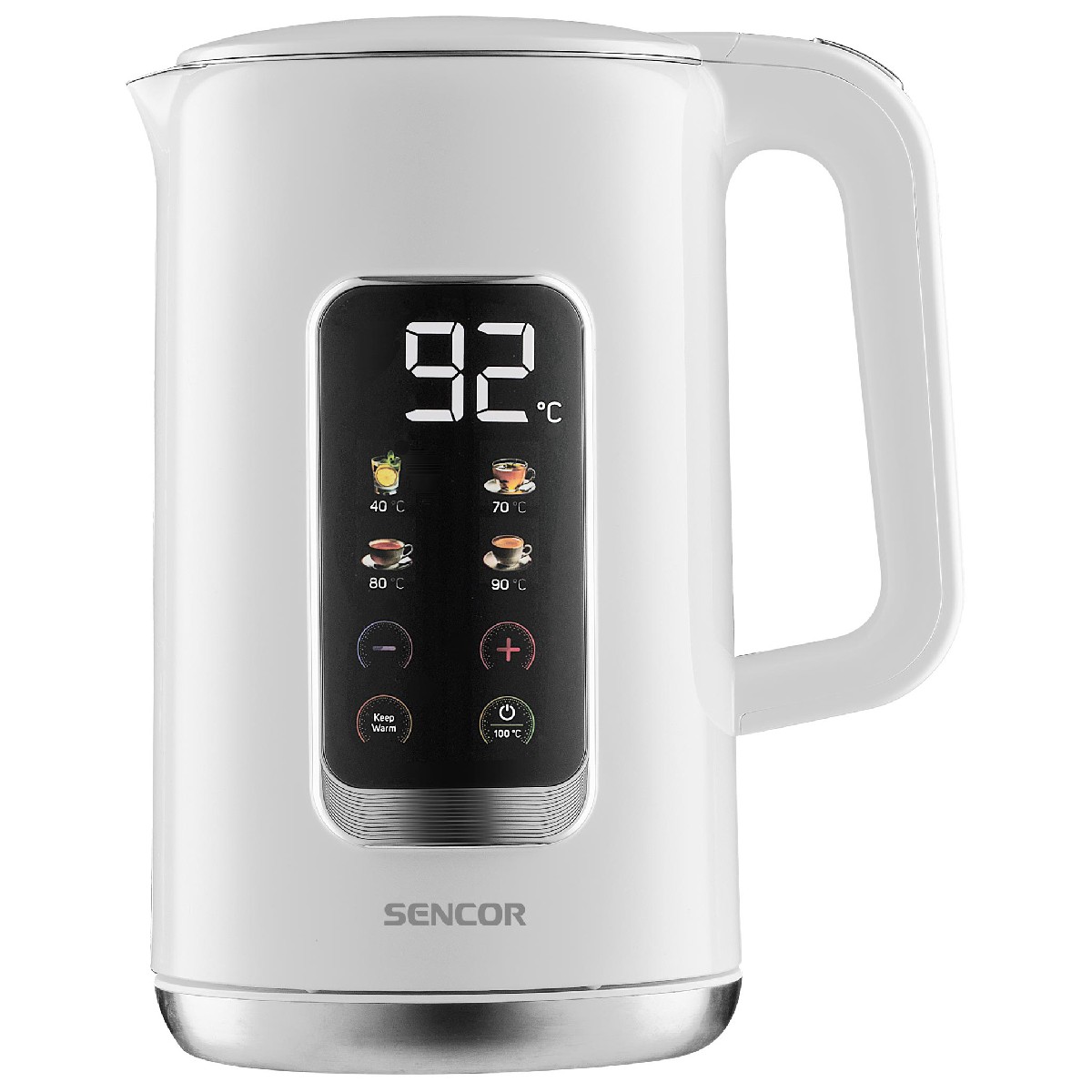 Βραστήρας Sencor SWK 0950WH με ισχύ 2200W και LED οθόνη ενδείξεων διαθέτει ρυθμιστή θερμοκρασίας και προρρυθμισμένα προγράμματα για απόλυτο έλεγχο. Με χωρητικότητα 1,7 λίτρων και σώμα με διπλό τοίχωμα από ανοξείδωτο ατσάλι και πλαστικό, προσφέρει ασφάλεια και αντοχή. Διαθέτει λευκό LED φωτισμό και τριπλό σύστημα ασφαλείας για προστασία από λειτουργία χωρίς νερό και αυτόματη απενεργοποίηση.