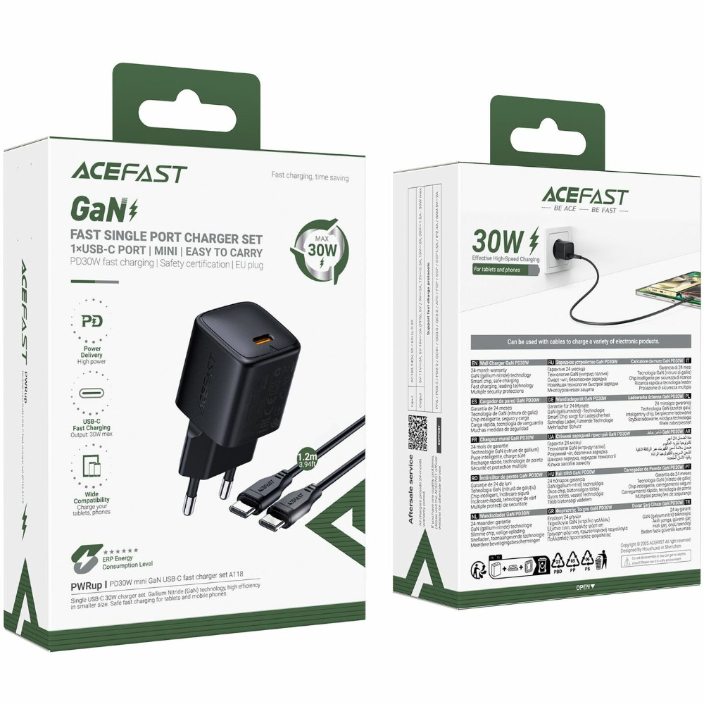 Φορτιστής Ταξιδίου Acefast A118 Mini Fast Charging 1xUSB-C PD30W QC3.0 GaN με USB-C σε USB-C Καλώδιο 1.2m Μαύρος