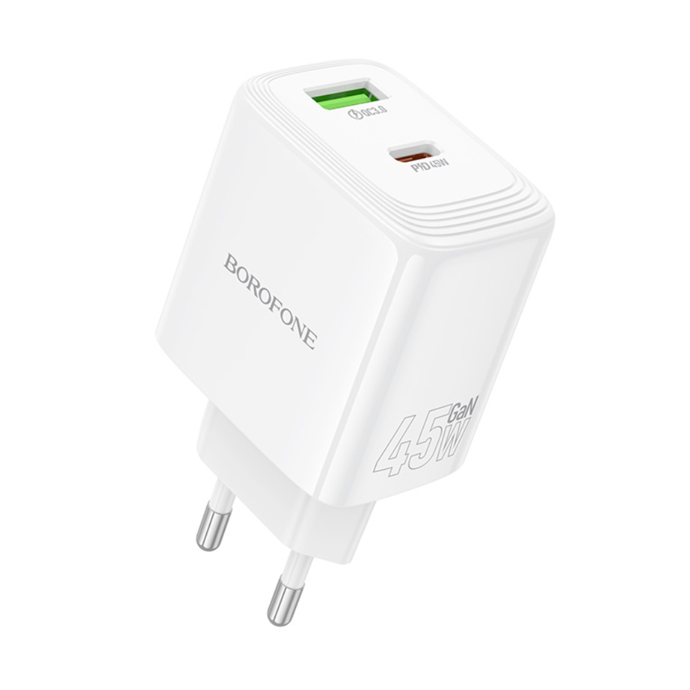 Φορτιστής Ταξιδίου Borofone BN30 Cargador GaN με 1xUSB-C PD45W και 1xUSB-A QC PD18W Λευκός