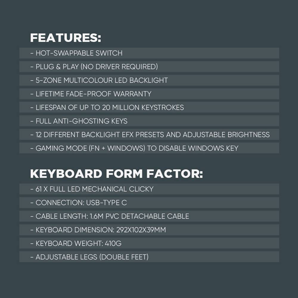 Αναβαθμίστε την εμπειρία σας στο gaming και την πληκτρολόγηση με το Armaggeddon MKA-1C Nex, ένα compact 61 πλήκτρων μηχανικό πληκτρολόγιο που συνδυάζει κορυφαία απόδοση, ανθεκτικότητα και στυλ. Ιδανικό για gamers και δημιουργούς που αναζητούν ακρίβεια, ταχύτητα και δυνατότητα πλήρους προσαρμογής.