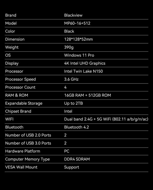 Blackview Mini PC – Intel N150, 16GB + 1TB, 4K, Dual Band, Windows 11 Pro – Μαύρο