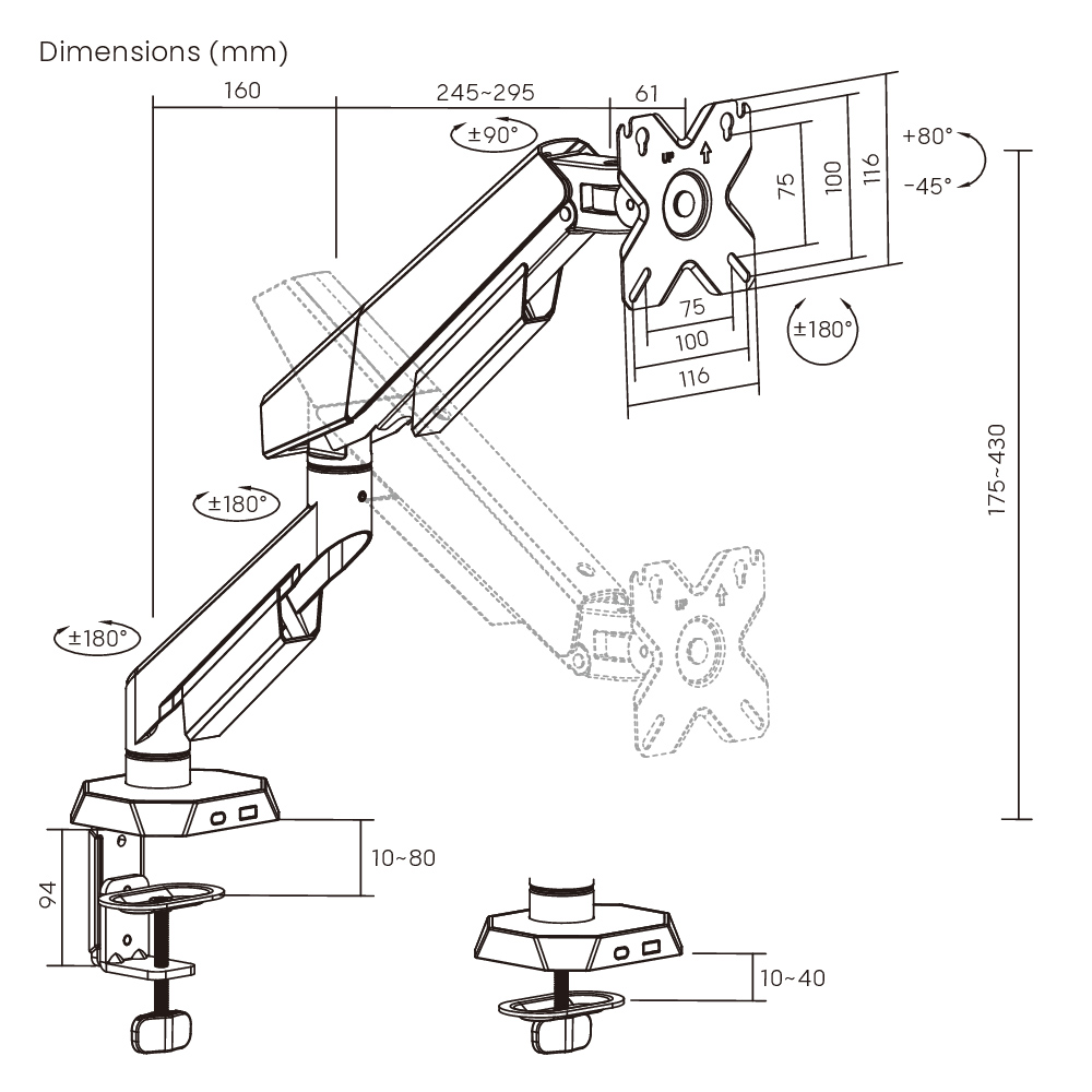 -πάχος επιφάνειας εργασίας: clamp: 10~80mm, grommet: 10~40mm
