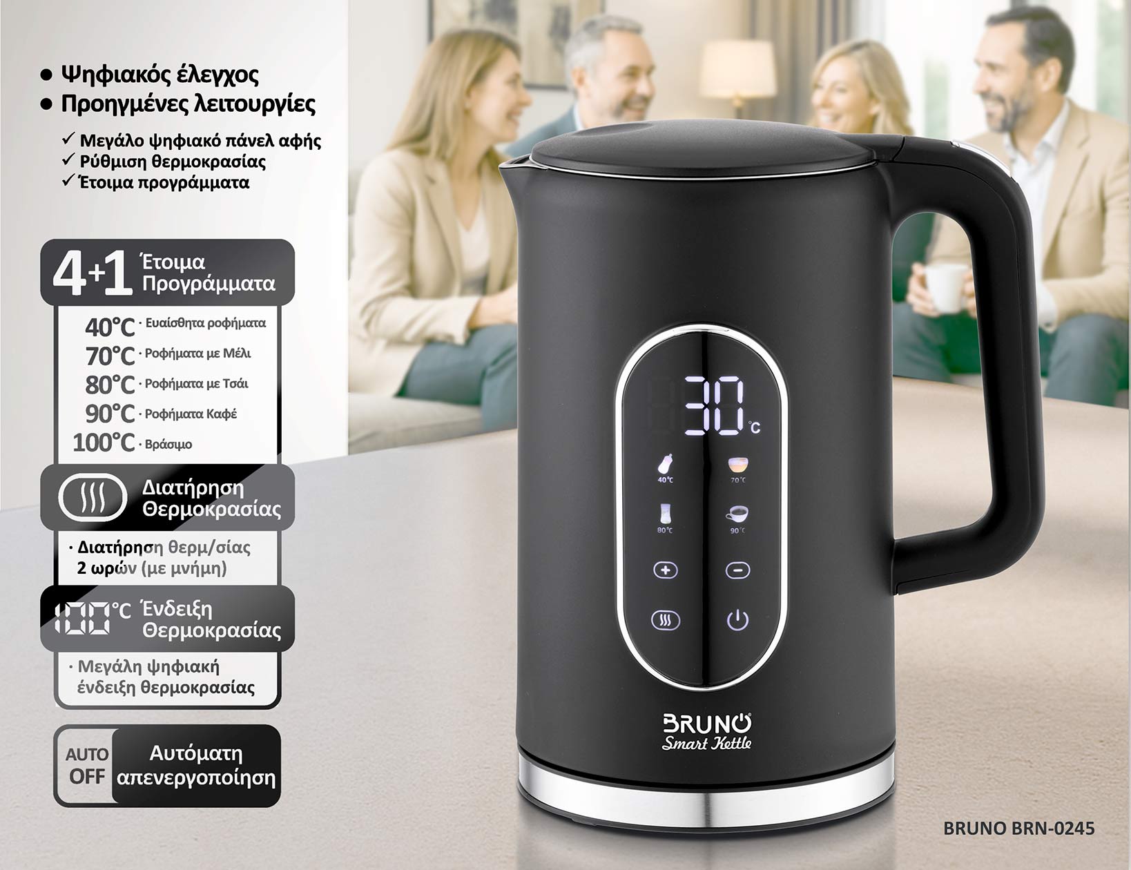BRUNO Βραστήρας νερού προηγμένων λειτουργιών, ψηφιακός με διπλό τοίχωμα BRN-0245, 1.7L 2200W, μαύρος