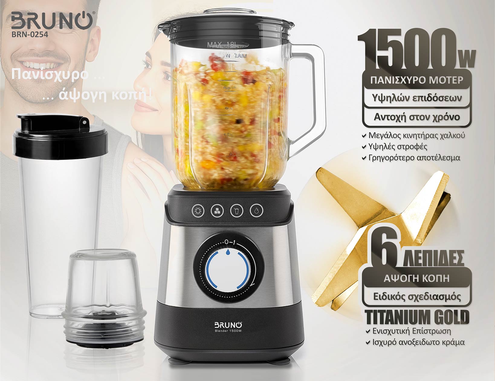 BRUNO Μπλέντερ 3 σε 1 προηγμένων λειτουργιών, BRN-0254, 1500W, 1.8L γυάλινη κανάτα, 6 λεπίδες, inox-μαύρο