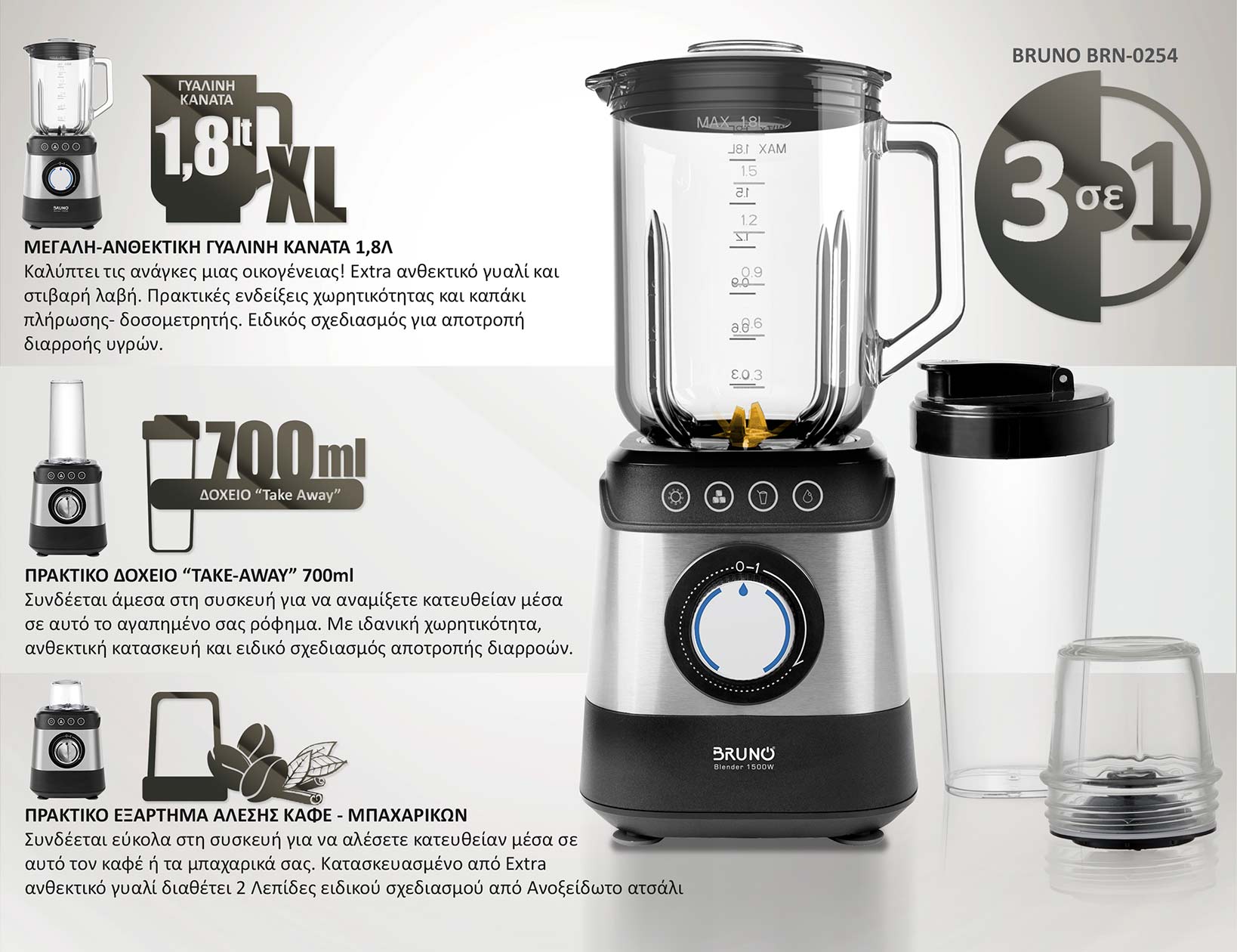 Ανακάλυψε το πολυλειτουργικό μπλέντερ BRUNO 3 σε 1, που συνδυάζει μπλέντερ υψηλής ισχύος (1500W), δοχείο take-away 700ml και αλεστή καφέ/μπαχαρικών σε μία συσκευή!