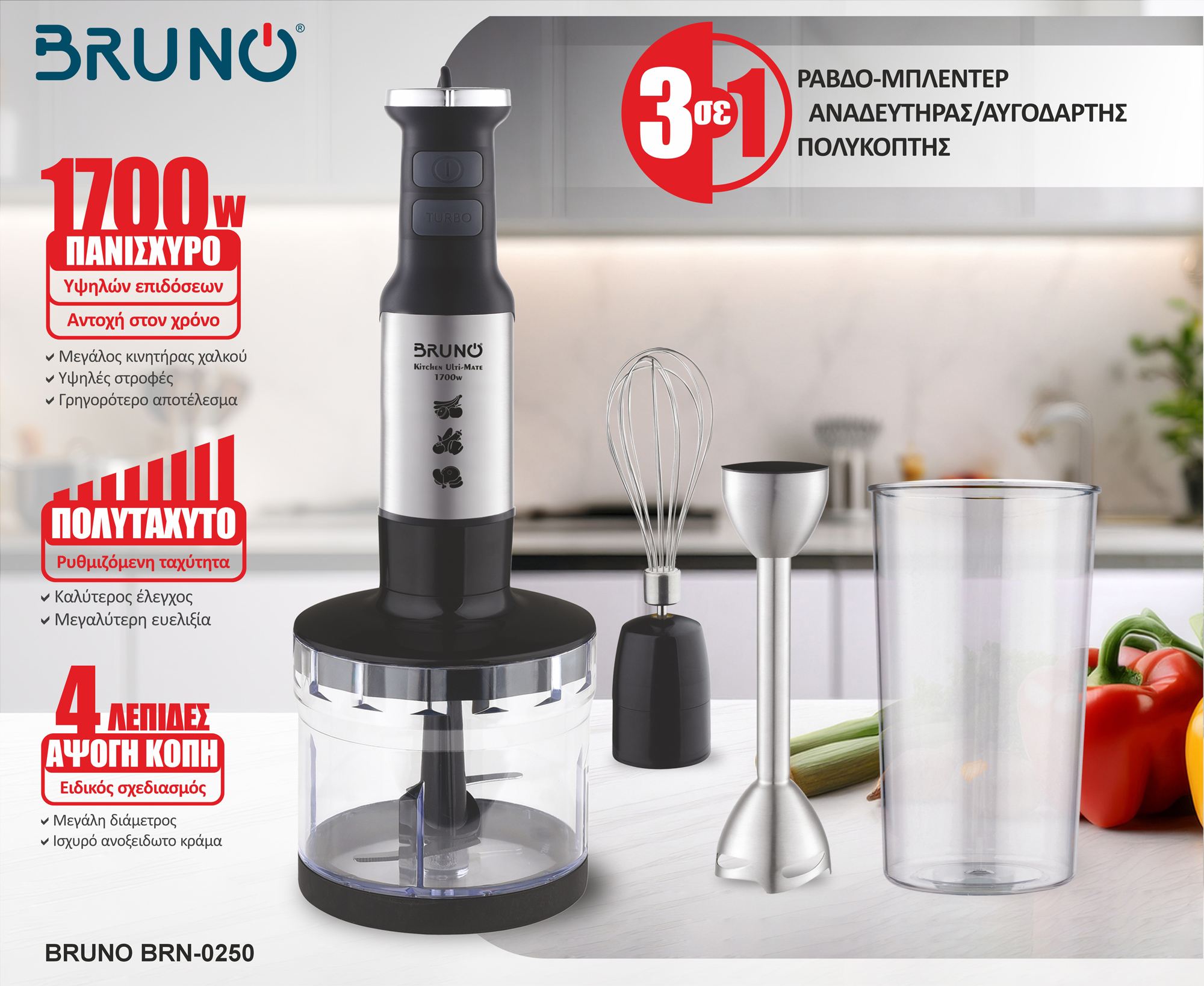 BRUNO ραβδομπλέντερ BRN-0250, 1700W Σετ 3 σε 1, ρυθμιζόμενη ταχύτητα, 4 λεπίδες, inox-μαύρο