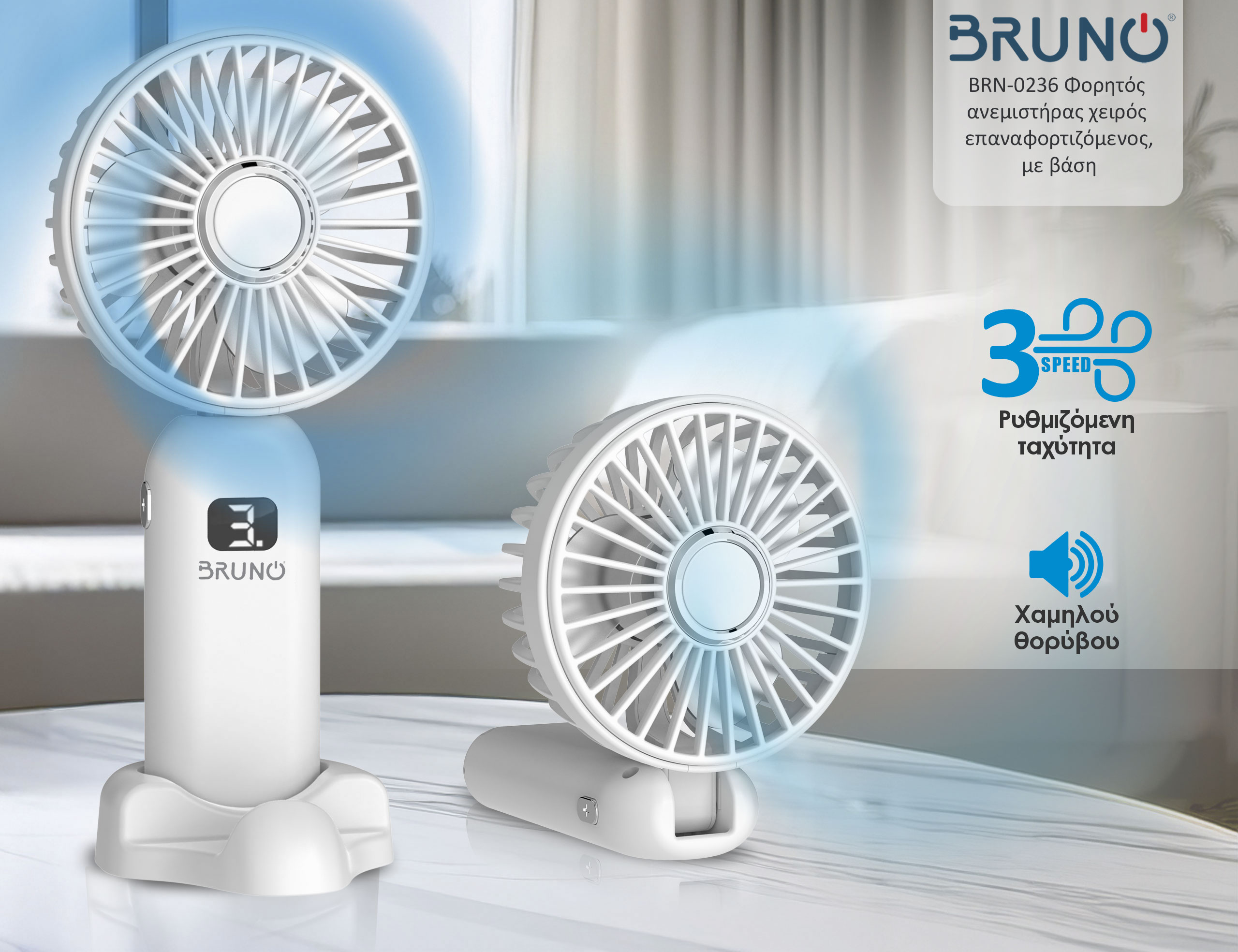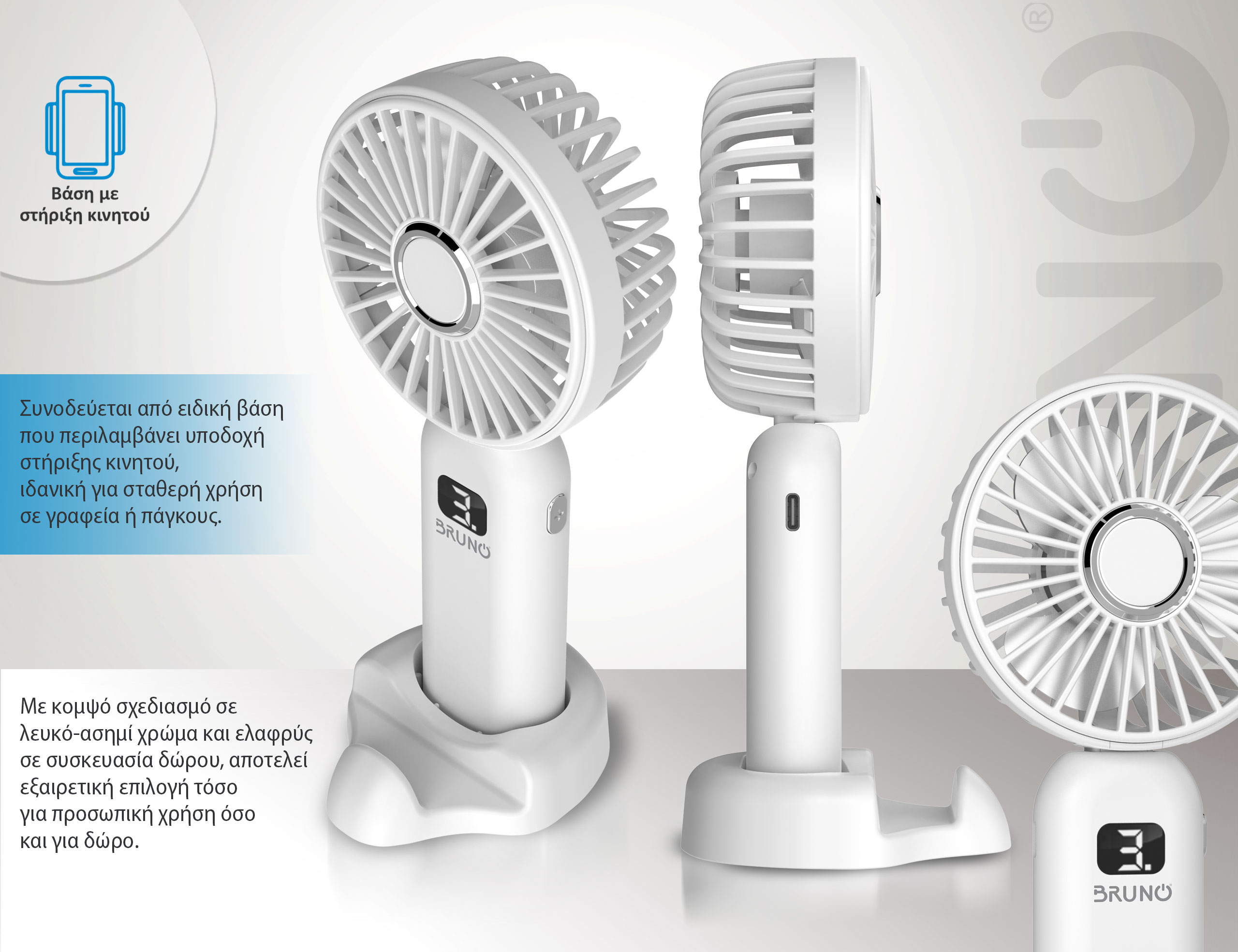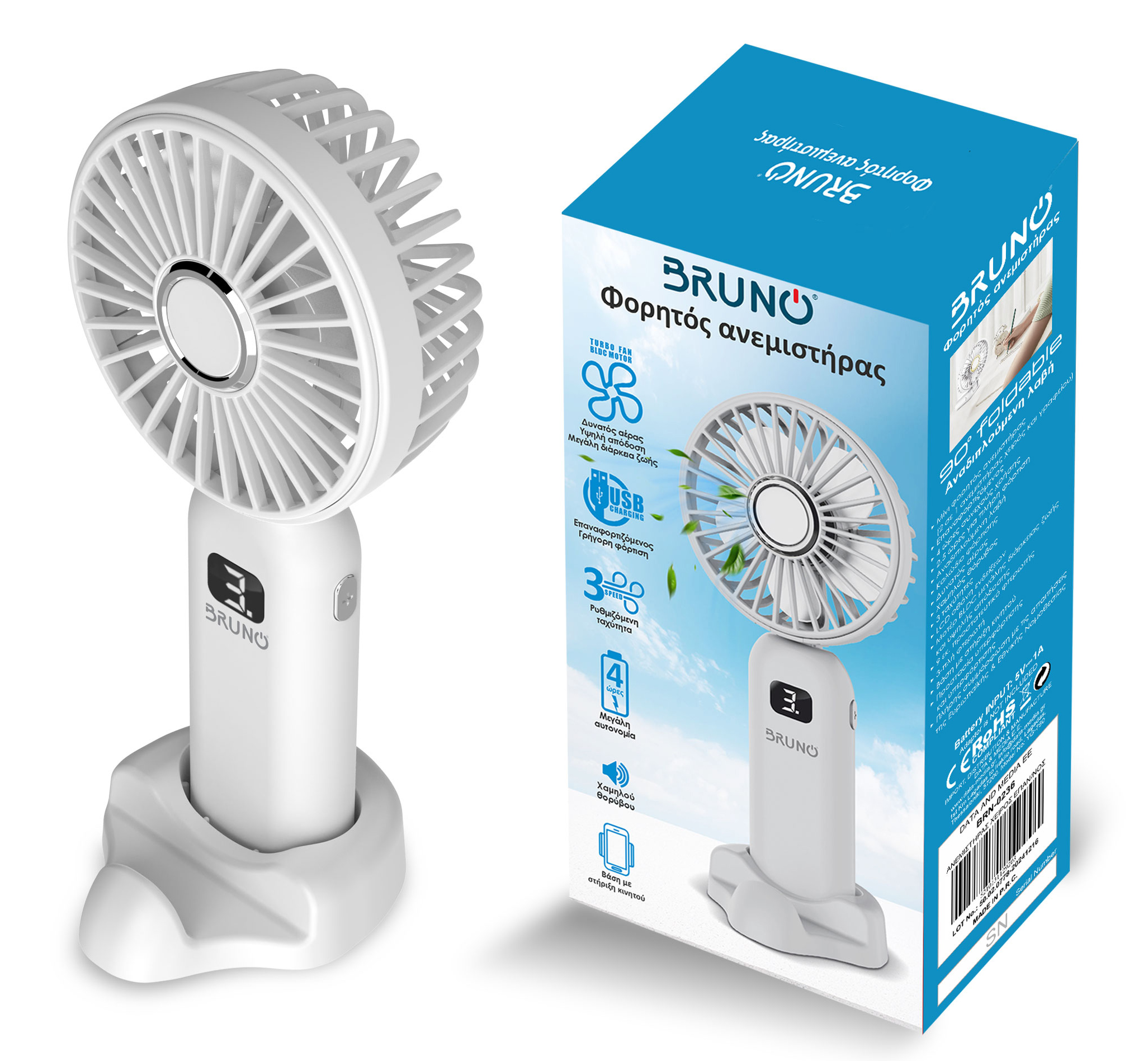 BRUNO φορητός ανεμιστήρας χειρός επαναφορτιζόμενος BRN-0236, με βάση, λευκός-γκρι