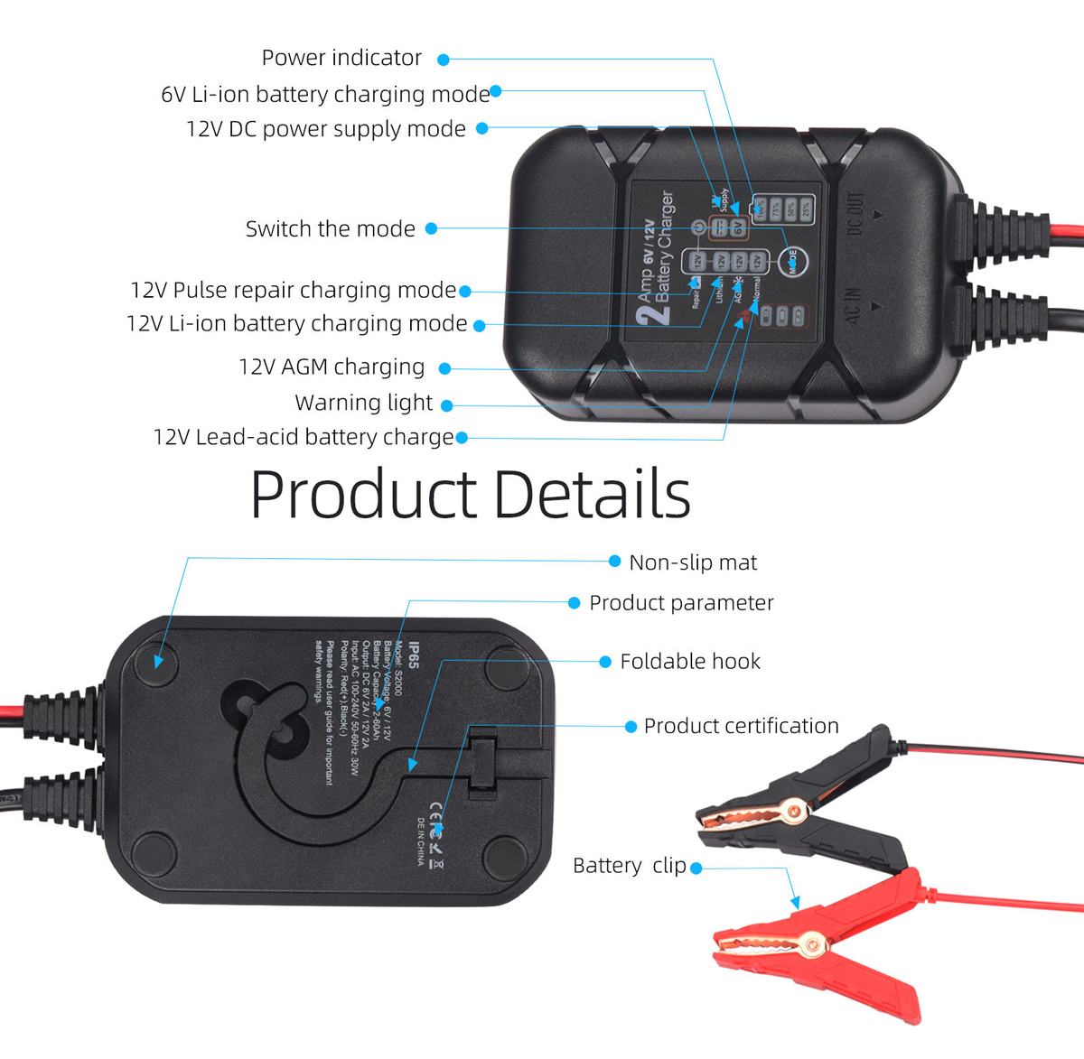 BYGD φορτιστής & συντηρητής μπαταρίας αυτοκινήτου S2000, 6-12V/2A