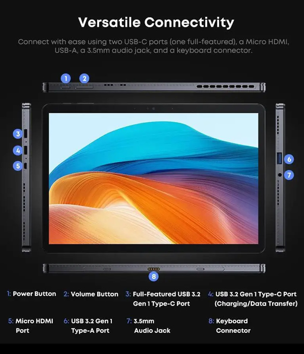-Θύρες: 2x USB-C, 3.5mm, USB 3.2, Micro HDMI, Connector pins για πληκτρολόγιο