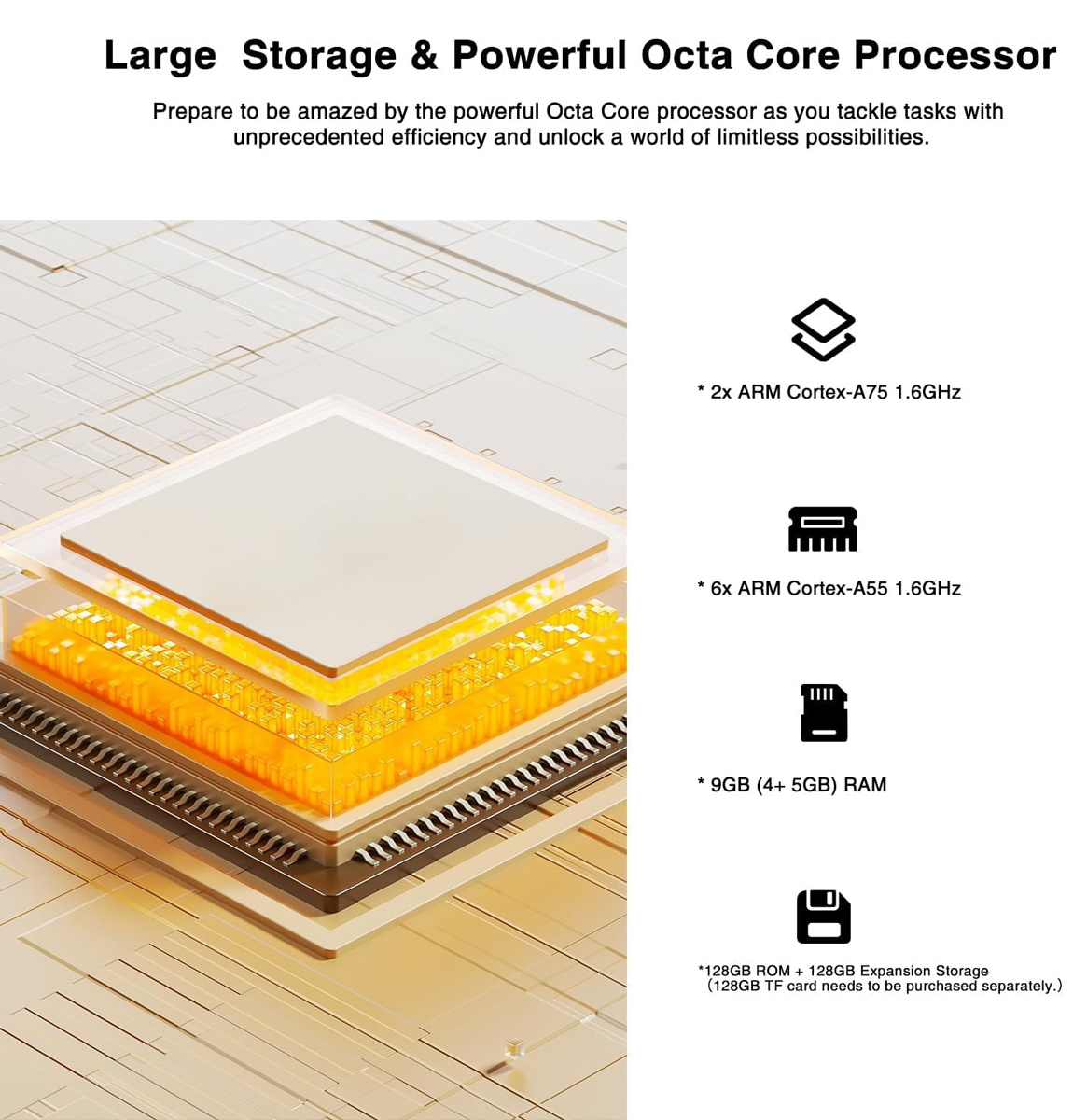 Με 4GB (+5GB virtual) RAM και 128GB ROM για να αποθηκεύετε τα αγαπημένα σας αρχεία, φωτογραφίες και βίντεο. Επιπλέον, προσφέρει την δυνατότητα να επεκτείνετε τον χώρο αποθήκευσης του tablet με κάρτα micro SD έως 1TB.