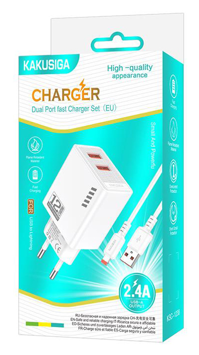 KAKUSIGA φορτιστής τοίχου KSC-1238 με καλώδιο Lightning, 2x USB, 12W, λευκός
