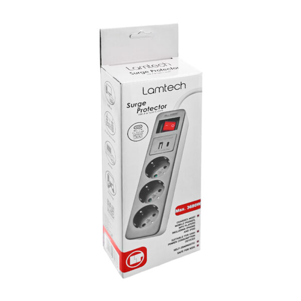 Το LAMTECH 3-Way Surge Protector προσφέρει αξιόπιστη προστασία και ευκολία σε κάθε χώρο. Με 3 πρίζες Schuko, μία θύρα USB (3.4A) και μία θύρα Type-C (17W), σας επιτρέπει να συνδέετε και να φορτίζετε πολλαπλές συσκευές ταυτόχρονα, εξασφαλίζοντας ταχύτητα, πρακτικότητα και ασφάλεια. Ιδανικό για το γραφείο, το σπίτι, αλλά και για συσκευές ψυχαγωγίας και gaming.