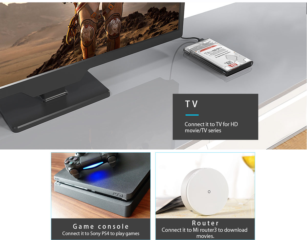 Εξωτερική θήκη για 2.5″ HDD / SSD η οποία μπορεί να συνδεθεί μέσω θύρας USB στον υπολογιστή, την τηλεόραση ή το κινητό σας (μέσω OTG). Είναι μικρή σε μέγεθος και προστατεύει αποτελεσματικά τον δίσκο.