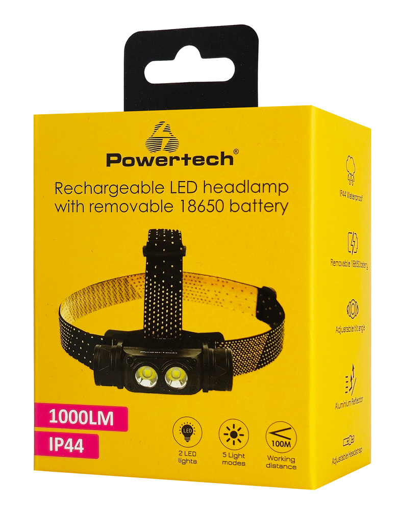 POWERTECH LED φακός κεφαλής PT-1549, επαναφορτιζόμενος, 1000lm, IP44, μαύρος