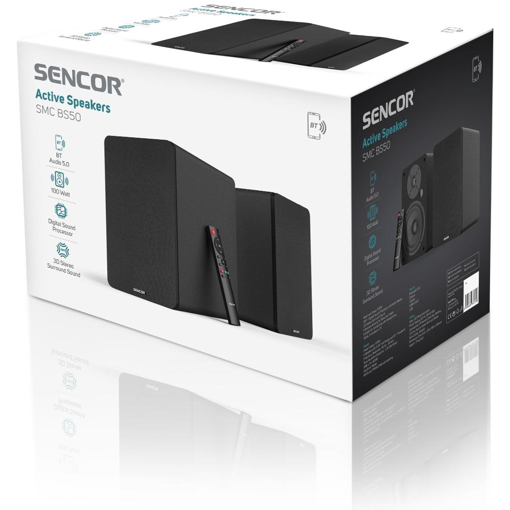 Τα Sencor SMC BS50 είναι αυτοενισχυόμενα ηχεία με μέγιστη ισχύ 200W, προσφέροντας καθαρό και εξαιρετικό ήχο μέσω δύο διπλής ζώνης ηχείων. Διαθέτουν δύο ενισχυτές για βέλτιστη απόδοση και ρύθμιση των μπάσων και των υψηλών συχνοτήτων. Ο ενσωματωμένος ψηφιακός επεξεργαστής ήχου DSP παρέχει λειτουργίες ήχου Movie, Music, News και 3D stereo surround. Υποστηρίζουν αναπαραγωγή μουσικής μέσω Bluetooth 5.0, ψηφιακής οπτικής ή HDMI εισόδου με λειτουργία ARC, USB ή αναλογικής εισόδου RCA. Το σύστημα διαθέτει ισχυρά ηχεία 5.25” full-range και tweeters 1” με εύρος συχνοτήτων 30Hz-30kHz και συνολική αρμονική παραμόρφωση ≤1%. Προσφέρει χειροκίνητη ρύθμιση μπάσων και υψηλών συχνοτήτων, καθώς και λειτουργίες ισοσταθμιστή. Οι διαθέσιμες είσοδοι περιλαμβάνουν Bluetooth, οπτική, coaxial, HDMI ARC και USB. Διαθέτει LED ένδειξη λειτουργιών, τροφοδοσία DC 24V/2.08A και συνοδεύεται από ασύρματο χειριστήριο, μπαταρία, καλώδια 3.5mm Jack σε Stereo RCA και Stereo RCA, καθώς και τροφοδοτικό. Το καλώδιο σύνδεσης των ηχείων έχει μήκος 2.5m. Οι διαστάσεις κάθε ηχείου είναι 278 x 168 x 240mm και το συνολικό βάρος 7.1kg