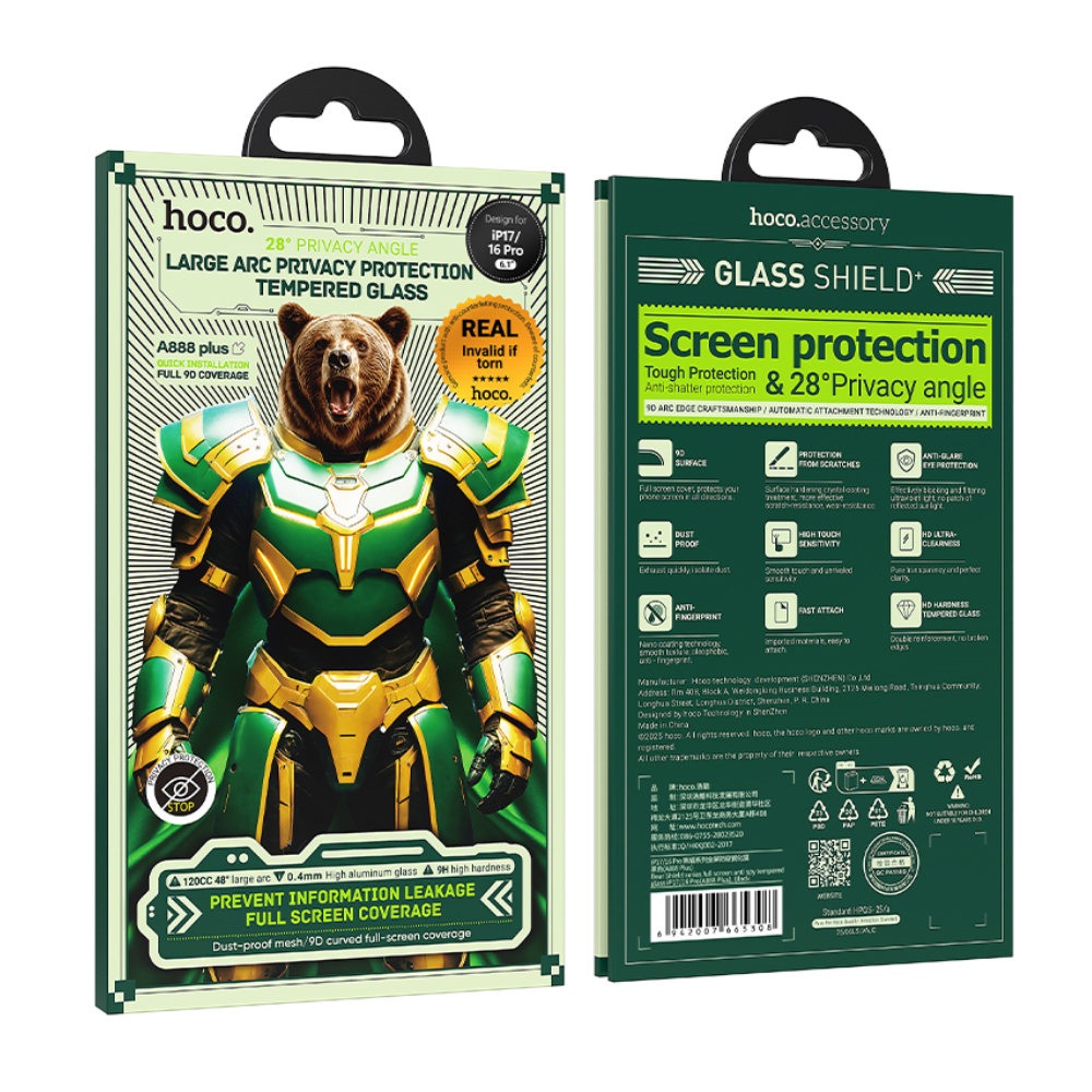 Tempered Glass Hoco Bear Shield A888 HD 4H 0.4mm Large Arc 28 Μοίρες Privacy Protection για Apple iPhone 17 16 Pro