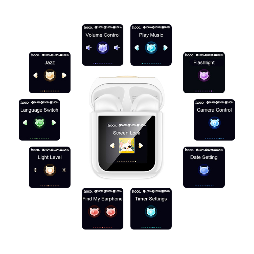 Ακουστικά Hoco EW86 BT με Bluetooth 5.4, χωρητικότητα μπαταρίας 300mAh για τη θήκη φόρτισης και 25mAh για κάθε ακουστικό, με χρόνο χρήσης έως 3,5 ώρες, έξυπνη οθόνη αφής για άμεση διαχείριση πολλαπλών λειτουργιών απευθείας από τη θήκη, ένδειξη στάθμης μπαταρίας και ώρας για ακουστικά και θήκη, διαστάσεις 54×44.5×23.3mm και μικτό βάρος 54g.